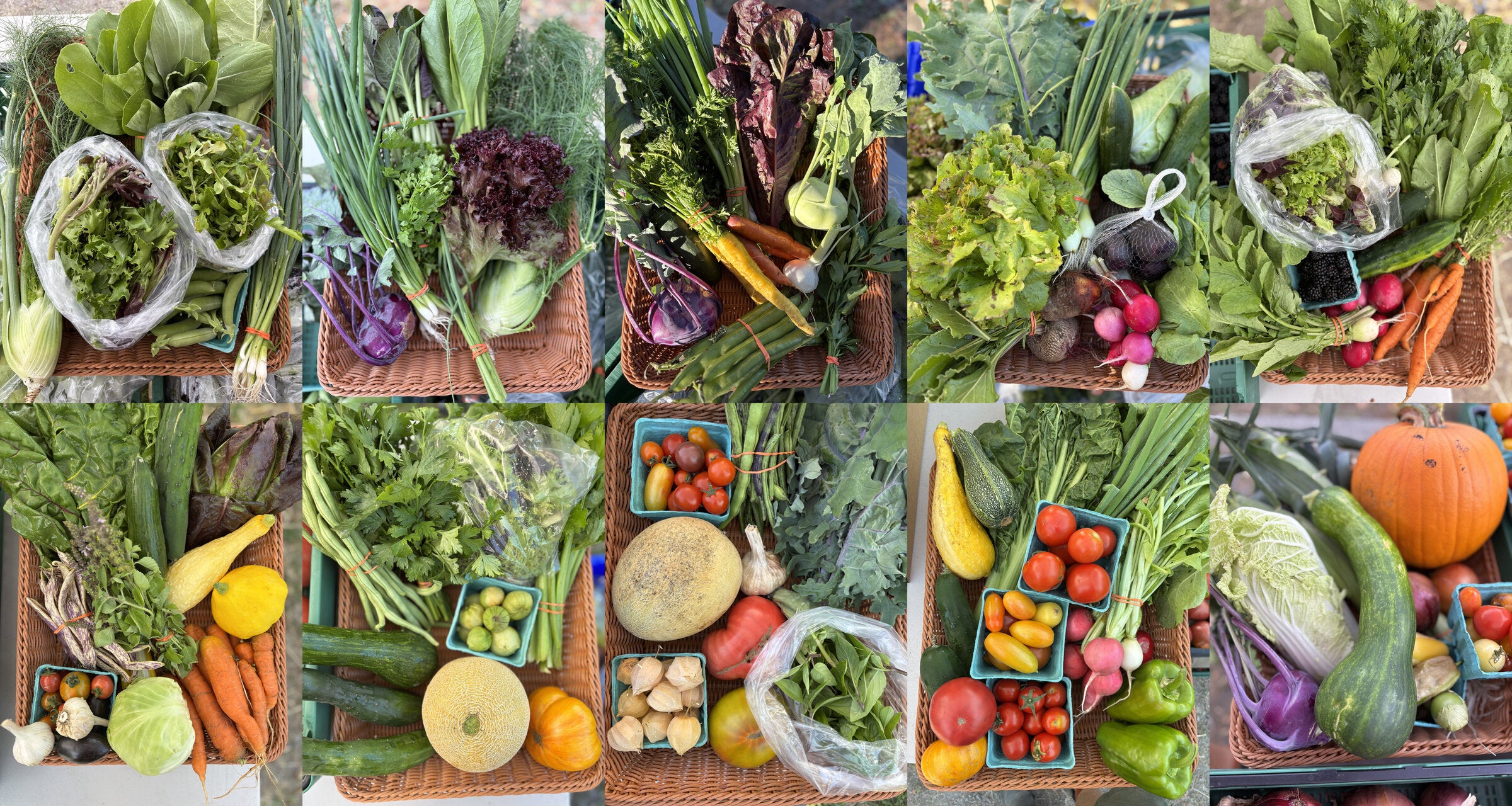 We grow 40 to 60 different crops in a year and that sometimes includes hundreds of different varieties of those crops. We are determined to find the absolute best crops out there and they get better every single year. You can expect lots of regular favorites like greens, carrots, tomatoes, and cucumbers that taste better than anything you've had before. Every now and then we throw in something a little more exotic, but don't worry we always make sure to let folks know how to use it.